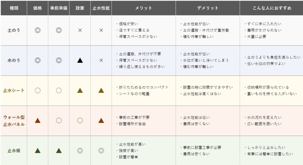 浸水対策を検討し始めた方向けに、代表的な方法をまとめて独自の基準で比較した一覧表です。