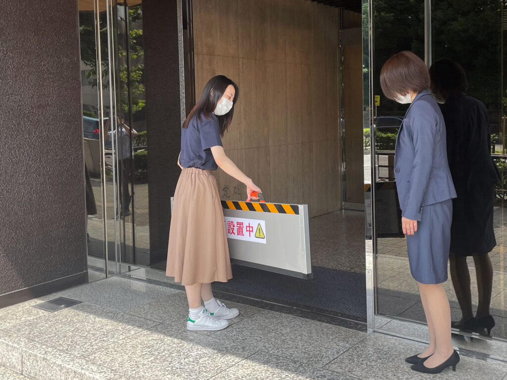 エントランスには防犯シャッターがついていて、自動で朝の7時に上がって夜の19時に閉まります。つまり、止水板を設置した状態でも防犯シャッターの開閉が出来なければいけません。